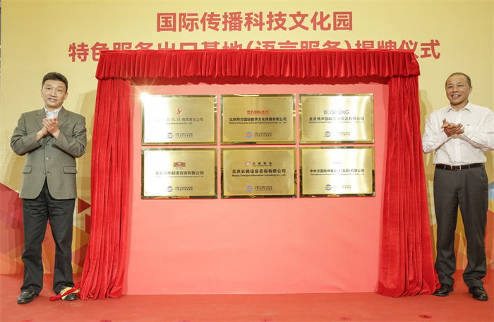 中国外文局局长杜占元,副局长陆彩荣、高岸明、刘大为、于涛及国图集团主要负责同志,分别为国际传播科技文化园特色服务出口基地(语言服务)、国际传播科技文化园、国际传播大厦、首批入驻国际传播大厦的6家外文局局属企业揭牌。首批入驻国际传播大厦的6家外文局局属企业是:海豚出版社有限责任公司、北京煦方国际数字文化传媒有限公司、北京博声国际文化交流有限公司、北京中外翻译咨询有限公司、北京长略信息咨询有限公司和中外文国际传播发展(北京)有限公司。